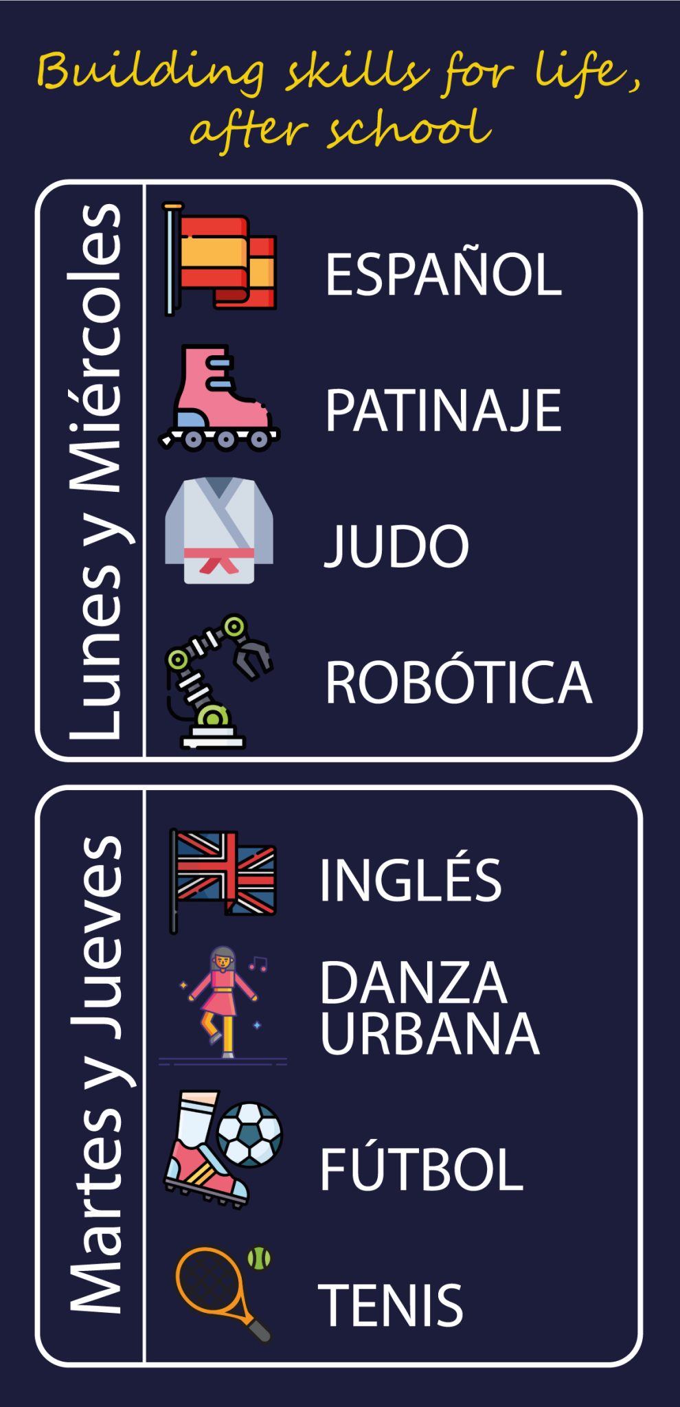 Los alumnos tienen la opción de completar su formación con actividades extraescolares que se desarrollan una vez terminadas las clases. Ya sean deportes como fútbol, tenis, judo,..o incluso natación dentro del horario escolar.